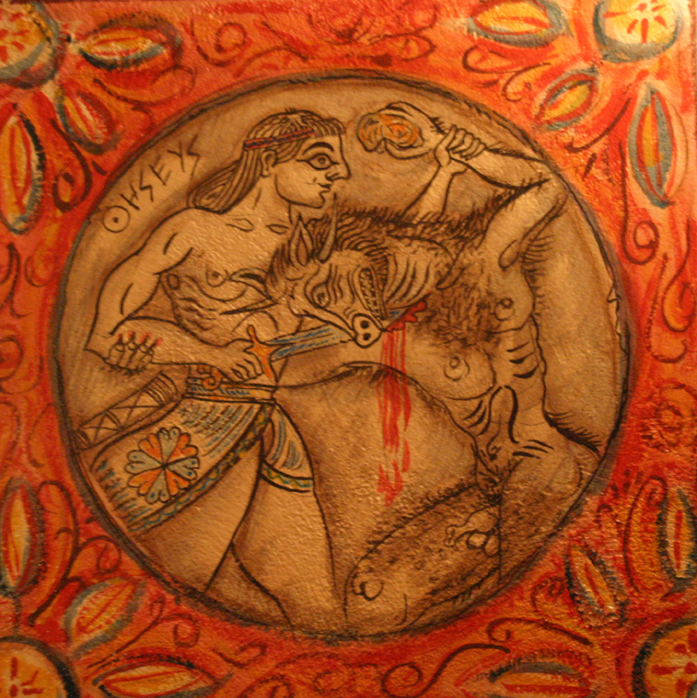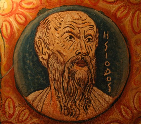 Παράλληλα διάλεξα να εικονογραφήσω, αυτά τα ποιήματα, με ζωγραφιές που έφτιαξα ο ίδιος, κυρίως στους τοίχους του σπιτιού μου. Θεοί – θεές – ημίθεοι – ήρωες και σοφοί απεικονίζονται με το δικό μου ΕΙΚΑΣΤΙΚΟ τρόπο… που στηρίζετε όμως πάνω σε αρχαϊκά ή κλασικά πρότυπα (αγγειογραφίες).