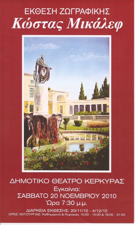 Έκθεση ζωγραφικής του Κερκυραίου ζωγράφου Κώστα Μικάλεφ θα πραγματοποιηθεί στο δημοτικό θέατρο Κέρκυρας. Η έκθεση θα διαρκέσει από τις 20 Νοέμβρη ως και τις 4 Δεκέμβρη.