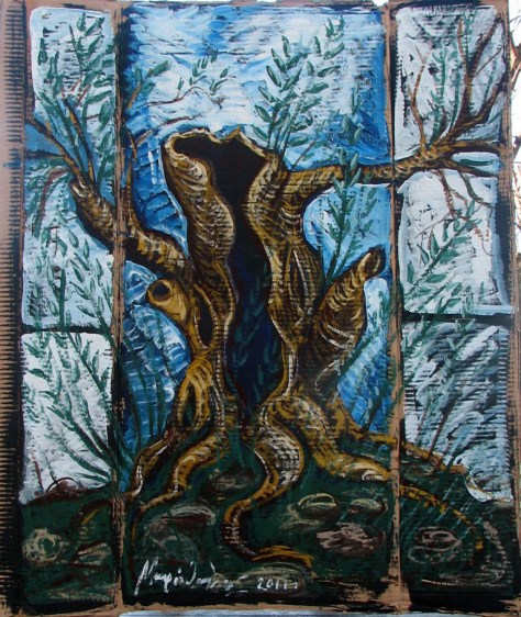 Έργο του PSMavro / Stavrioti, με θέμα... «Καμένη Eλιά που δίνει και πάλι κλαδιά». Aκριλικά και σκόνες πάνω σε χαρτόκουτα.