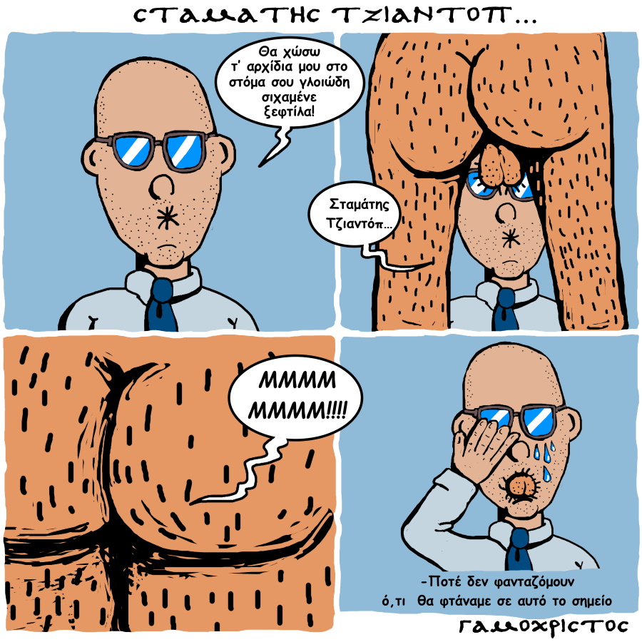 Τα ονόματα και οι καταστάσεις του κόμικ είναι προϊόντα φαντασίας. Ουδεμία σχέση έχουν με πρόσωπα ή καταστάσεις της δυστοπικής καθημερινότητας και ουδεμία πρόθεση έχει να παροτρύνει κόσμο να χώσει όρχεις ή άλλα γενετήσια όργανα στο στόμα κάποιου, χωρίς τη θέληση του.