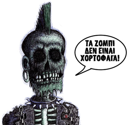 Ήταν νωρίς το πρωί και έξω φαινόταν καθαρό το τοπίο. Αποφασίσαμε να μην πάρουμε το αμάξι με το οποίο είχαμε έρθει για να μην τραβήξουμε την προσοχή τους με το θόρυβο της μηχανής. Δυο λεπτά με τα πόδια ήταν ούτως ή άλλως. Πηδήξαμε τα κάγκελα και τρέξαμε μέχρι τη γωνία. Ένας νεκροζώντανος μπάρμπας καθόταν στο καφενείο και απλά μας κοιτούσε με το βλέμμα καρφωμένο. Κάποιες συνήθειες δύσκολα αλλάζουν. Μπροστά μας, στα δέκα μέτρα βρισκόταν ένας σάπιος, καραφλός τουρίστας, λιγάκι μεγαλόσωμος. Αποφασισμένος εγώ, κρατάω σφιχτά το τσεκούρι στο δεξί μου χέρι, κάνω δυο-τρία βήματα και εκτοξεύω με όλη μου τη δύναμη το τσεκούρι κατά πάνω του! Αρχίδια. Δεν τον πέτυχα και η εξαδέλφη γαμήθηκε στα γέλια. Σηκώθηκε και ο μπάρμπας από το καφενείο τώρα και άρχισε να βαδίζει αργά προς το μέρος μας. “Δώσε μου την πιρούνα!” της είπα. “Για να την εκτοξεύσεις και αυτή;” είπε γελώντας και μου την έδωσε. Αυτή τη φορά πήρα φόρα κρατώντας την πιρούνα μπροστά, όρμισα στον τουρίστα καρφώνοντας τον στην κοιλιά και τον σώριασα κάτω. Έπειτα πήρα το τσεκούρι από την άσφαλτο, το σήκωσα ψηλά και του το κατέβασα στο κεφάλι κομματιάζοντας το. Όλο αυτό το αίμα μου έφερε αναγούλα. Ξέρασα. Η Ερασμία έτρεξε κοντά μου. “Ήρωα μου!” είπε γελώντας, τράβηξε την πιρούνα από τα σωθικά του τουρίστα, πλησίασε τον μπάρμπα στα δύο μέτρα και εκεί που ετοιμάστηκε να τον καρφώσει, ο μπάρμπας παραπάτησε και σωριάστηκε πίσω ανάσκελα. Πριν προλάβει να σηκωθεί του έχωσε αργά την πιρούνα στο κεφάλι τρυπώντας του τα μάτια.