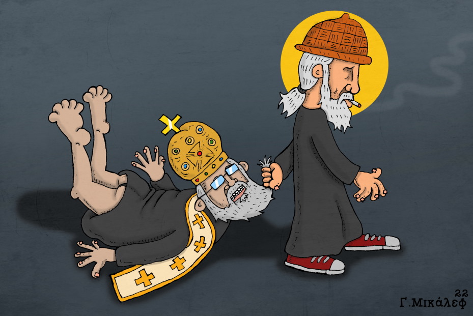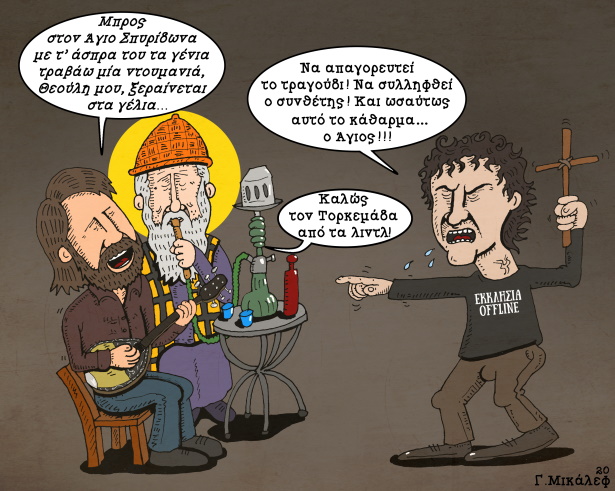 Κάποτε ο Άγιος Σπυρίδωνας μπούχτισε από την οικονομική εκμετάλλευση του ταλαίπωρου κουφαριού του και αποφάσισε να επαναστατήσει κατά του κλήρου. Αφορμή στάθηκε η απόφαση του Οικονομικού Διευθυντή του Ιερού Καταστήματος να τεμαχίσει τον Άγιο σε περισσότερα κομμάτια για ακόμα μεγαλύτερα έσοδα (βλέπε εδώ). Επί τρεις νύχτες κυνηγούσε ο Άγιος στα στενά της πόλης τoν Μητροπολίτη και τους άλλους τράγους, πετώντας τους φλεγόμενα κεραμίδια. Ντόπιοι και τουρίστες, σοκαρισμένοι από το θέαμα, άρχισαν να ανεβάζουν stories στο insta και να μιλάνε για μέγα θαύμα. Την τέταρτη νύχτα ο Άγιος κατάφερε να αρπάξει τον Μητροπολίτη από τα μούσια, να τον σύρει μέσα στο Ιερό Κατάστημα και να τον κλείσει στη λάρνακα. Έπειτα τον βαλσάμωσε και του ‘κοψε το δεξί χέρι και το δεξί παπάρι για να τα στέλνει τουρνέ στην επαρχία. Από τότε, κάθε πρώτη Κυριακή του Νοέμβρη, ο Κερκυραϊκός λαός πλημμυρισμένος από θρησκευτική καυλάνυξη λιτανεύει τον Μητροπολίτη στους δρόμους, γιορτάζοντας έτσι το μεγάλο θαύμα του Άγιου Σπυρίδωνα.