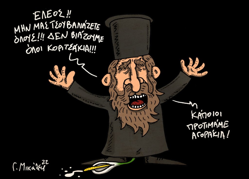 Πήγα στα γραφεία τους και με το καλημέρα, με ξόρκισε «ο παπάς της εφημερίδας» κραδαίνοντας το καυλιτσέκι του και ραντίζοντας ταυτόχρονα με αγιασμό τα μάτια μου. Του φωνάζω «τι εκφυλιές είναι αυτές» και τότε με την απειλή περιστρόφου, με οδήγησε στην «Αίθουσα Επιφοίτησης Αγίου Πνεύματος». Με οδηγεί σε ένα γραφείο με υπολογιστή και μου αλυσοδένει τα πόδια στην παράξενη καρέκλα ενός γραφείου. Δεν ήταν όμως καρέκλα… ήταν ένα πράγμα σαν χεστροκαρέκλα γραφείου. Κοιτώντας γύρω μου παρατήρησα ότι υπήρχαν τουλάχιστον άλλα 10 γραφεία με λιγδιασμένους κι άθλιους εμφανισιακά νεαρούς που φαινόταν και αυτοί να είναι δεμένοι. Εκείνοι έγραφαν με μανία στους υπολογιστές και ο ιερέας περνούσε από γραφείο σε γραφείο και τους έδινε να πιουν από ένα μπουκάλι με αγιασμό. Όποιος αρνιόταν να πιει την προβλεπόμενη ποσότητα, του έστριβε τις ρόγες. Εντάξει σκέφτηκα… το βγάλαμε το μεροκάματο και με ‘πιάσαν κλάματα. Με πλησίασε τότε ένας άλλος ιερέας, εύσωμος αρκετά, με δερμάτινο ράσο. Με άρπαξε από τα μαλλιά και μου χτύπησε το κεφάλι στο γραφείο με δύναμη. Έχασα τις αισθήσεις μου.
