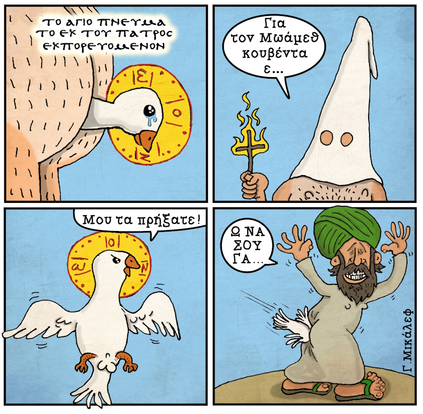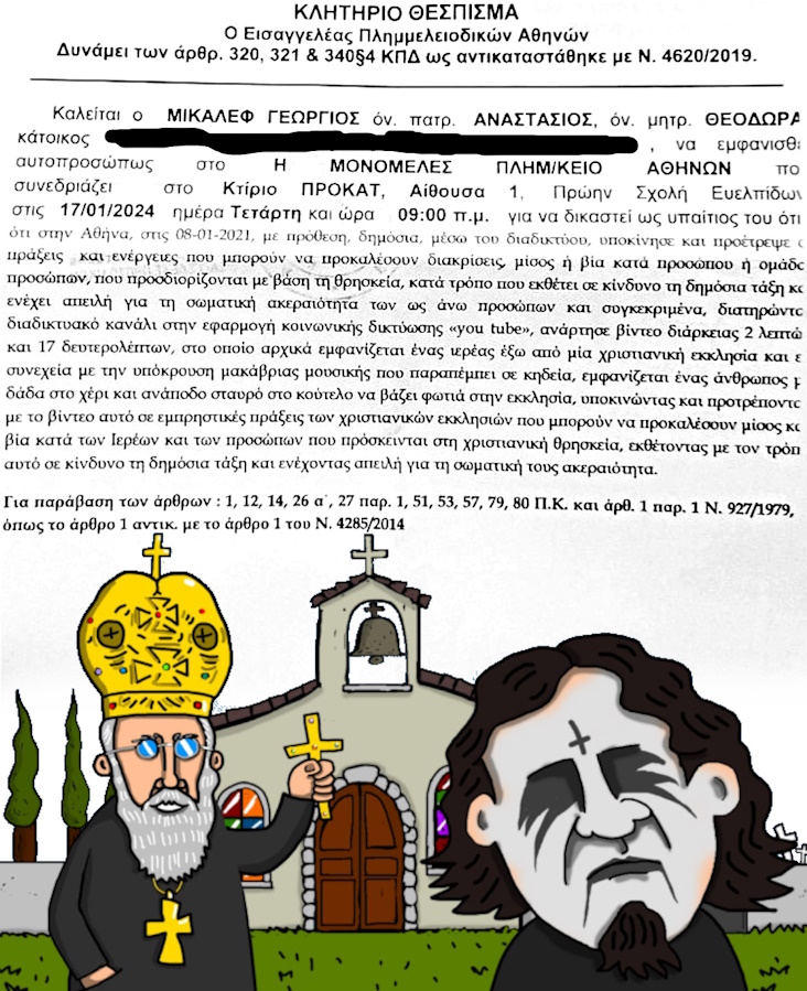 Μια ιστορία που ξεκίνησε το 2021 έλαβε τέλος στο πλημμελειοδικείο μετά από μια αναβολή. Ένα «κακό ανιμέσιο» με μια φανταστική εκκλησία να τυλίγεται σε φανταστικές φλόγες ήταν η αιτία να δικαστώ με τον αντιρατσιστικό νόμο για αυτή μου την καλλιτεχνική δημιουργία. Η δικογραφία βασίστηκε σε άρθρο γνωστού εκδότη – δικηγόρου – συγγραφέα – ακτιβιστή (βλέπε διαμαρτυρία έξω από βλάσφημο σουβλατζίδικο). Δεν ήταν αυτός βέβαια που έκανε την καταγγελία. Αφού προσπαθήσαμε να εξηγήσουμε τα αυτονόητα και παρόλο που ο εισαγγελέας πρότεινε την ενοχή μου με κάποια ελαφρυντικά, η πρόεδρος με έκρινε αθώο. Να ευχαριστήσω ξανά τον κύριο Βασίλη Σωτηρόπουλο που με εκπροσώπησε ως συνήγορος υπεράσπισης και ευχαριστώ πολύ τη σύζυγο μου και τον φίλο ποιητή και θεολόγο Γιώργο Κουτούβελα που στάθηκαν δίπλα μου ως μάρτυρες υπεράσπισης.