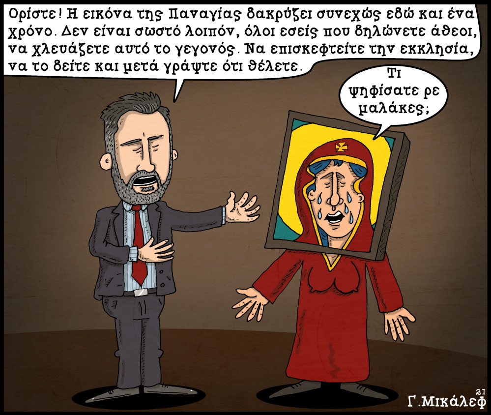 Η εικόνα της Παναγίας στον Ιερό Ναό Αγίου Δημητρίου στο Βύρωνα, δακρύζει συνεχώς εδώ και ένα ολάκερο χρόνο, μας πληροφορεί γνωστός βουλευτής της άριστης κυβέρνησης μας. Ο καθένας είναι ελεύθερος να πιστεύει σε ό,τι θέλει και να ψηφίζει φυσικά ό,τι θέλει. Δεν είναι σωστό όλοι εσείς που δηλώνετε άθεοι, να χλευάζετε αυτό το γεγονός. Να επισκεφτείτε την εκκλησία, να το δείτε και μετά γράψτε ότι θέλετε. Ακόμα να πιστέψετε Άθεοι;;;