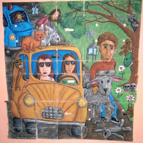 Το μεσημέρι έβγαλε τα χρώματα του και έκατσε πίσω στην αυλή παρέα με τη μαϊμού και τα εφτά του φίδια και ζωγράφιζε τη νιόστολη τη Μουραλίνβα. Λίγο πιο πάνω ήσουνα συ, καβάλα στο ολοζώντανο αρκούδι σου & έβγαινες από το κάστρο του Πεπίνου. Ο Μανιτού έκανε και ένα καλό και οι κοιλάδες του δόθηκαν αντιπαροχή στον Χουάν Μάτους τον Ντάτουρα που μετά το σάλτο μορτάλε των σαμάνων, εμφανίστηκε ξανά στις στέπες τις Ασίας να παίζει χαρτιά με τον Βαγγέλη τρώγοντας κρέπες. Ο γάτος του θείου, ξέπνοος σαν εκκρεμές, τον περίμενε ώρα να γυρίσει και το ξεροκόμματο πιο πέρα κινούσε για τον κήπο μπας και ξαναβρεί το γανόδερμα που σάπισε στο αυτοκίνητο. Ήταν και ο Δημήτρης στο μπαλκόνι με τσιγάρο & καφέ κλασικά και χάζευε το βιολιτζή που κοιμόταν με τη μια του κόρη στο πλευρό του. Στη γέφυρα ο κελαινεφής ποιητής παρακολουθούσε αφ’ υψηλού το μεσημεριανό παραλήρημα και ένας άγιος που τον γνώρισε στο νοσοκομείο, του έβαζε λόγια για τις μούσες του…