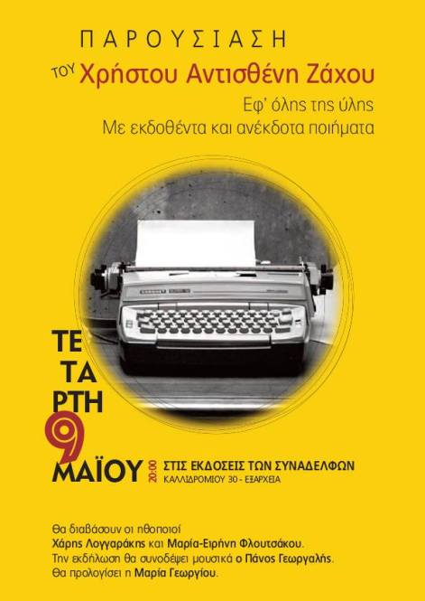 Παρουσίαση του  φίλου και συνεργάτη μας Χρήστου Αντισθένη Ζάχου εφ’ όλης της ύλης με εκδοθέντα και ανέκδοτα ποιήματα. Θα διαβάσουν οι ηθοποιοί Χάρης Λογγαράκης και Μαρία-Ειρήνη Φλουτσάκου. Την εκδήλωση θα συνοδέψει μουσικά ο Πάνος Γεωργαλής. Θα προλογίσει η Μαρία Γεωργίου.