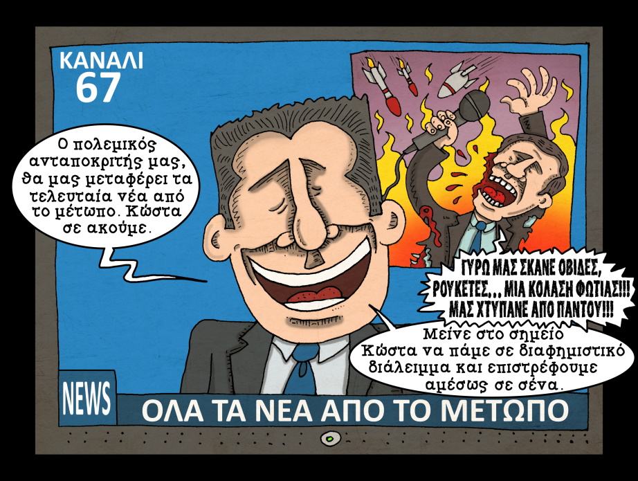Δελτίο ειδήσεων με τη Γαλλική σημαία πίσω με την έντιμη παρουσιάστρια να απαγγέλει. Οι ηλίθιες προφητείες του άγιου τρελόγερου για τον τρίτο παγκόσμιο. Η κυβέρνηση τον παίζει με ένα μουδιασμένο αριστερό χέρι και ο εορτασμός της δεκαεφτά Νοέμβρη για ένα σύστημα και μια χούντα που δεν έφυγε ποτέ… Οι βομβαρδισμοί κατά του ISIS από Γαλλικά αεροπλάνα έχουν ξεκινήσει από χθες το βράδυ. Συγκεκριμένα στην πόλη Ράκα της Συρίας, που θεωρείτε προπύργιο του Ισλαμικού Κράτους. Οι Τζιχαντιστές κομπάζουν πως δεν είχαν απώλειες. Όπως ήταν λογικό, θα περίμεναν τα συγκεκριμένα αντίποινα. Η συνέχεια στις ειδήσεις και τα έκτακτα δελτία…